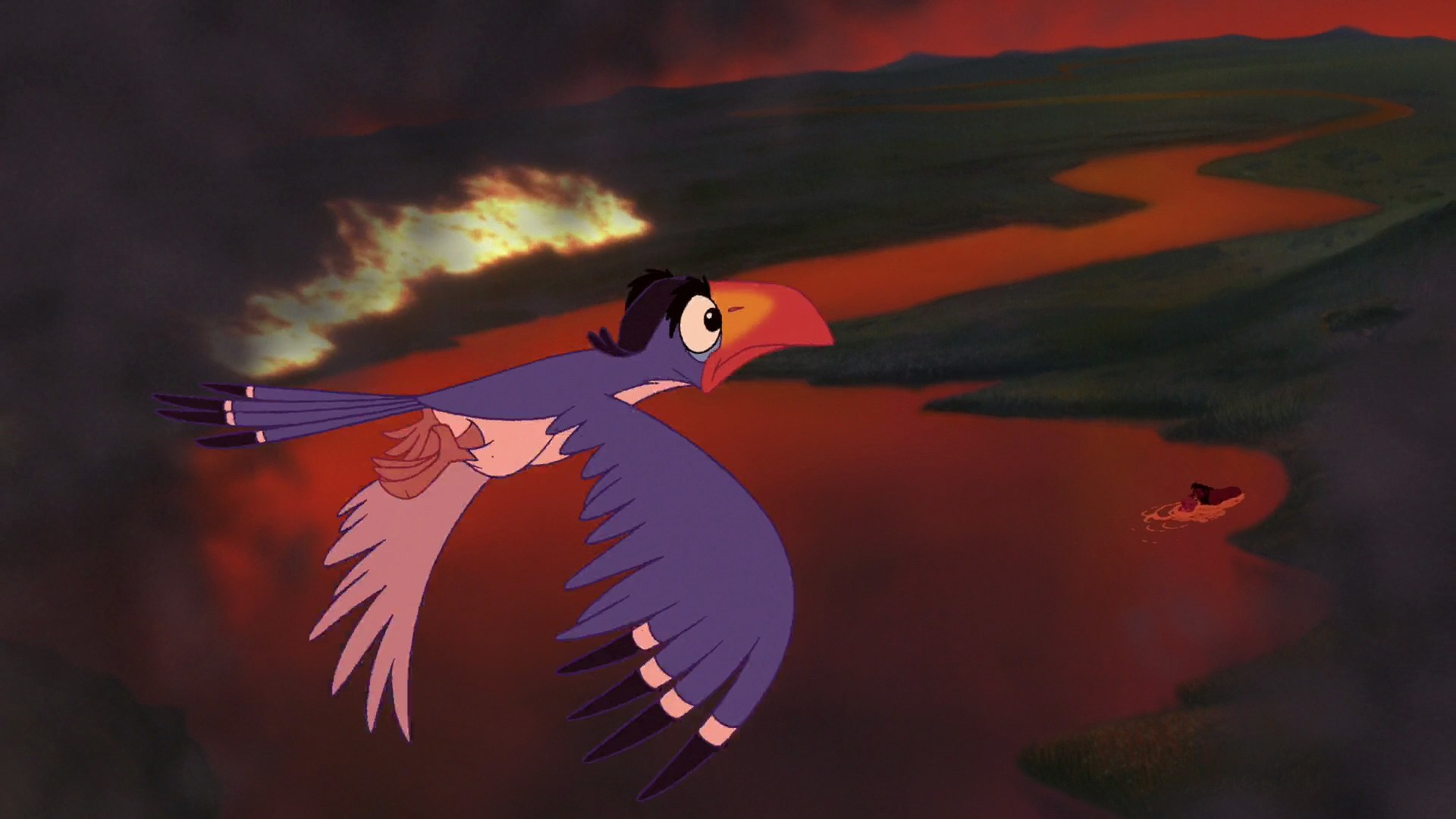 Zazu spots Kovu rescuing Kiara from a fire.