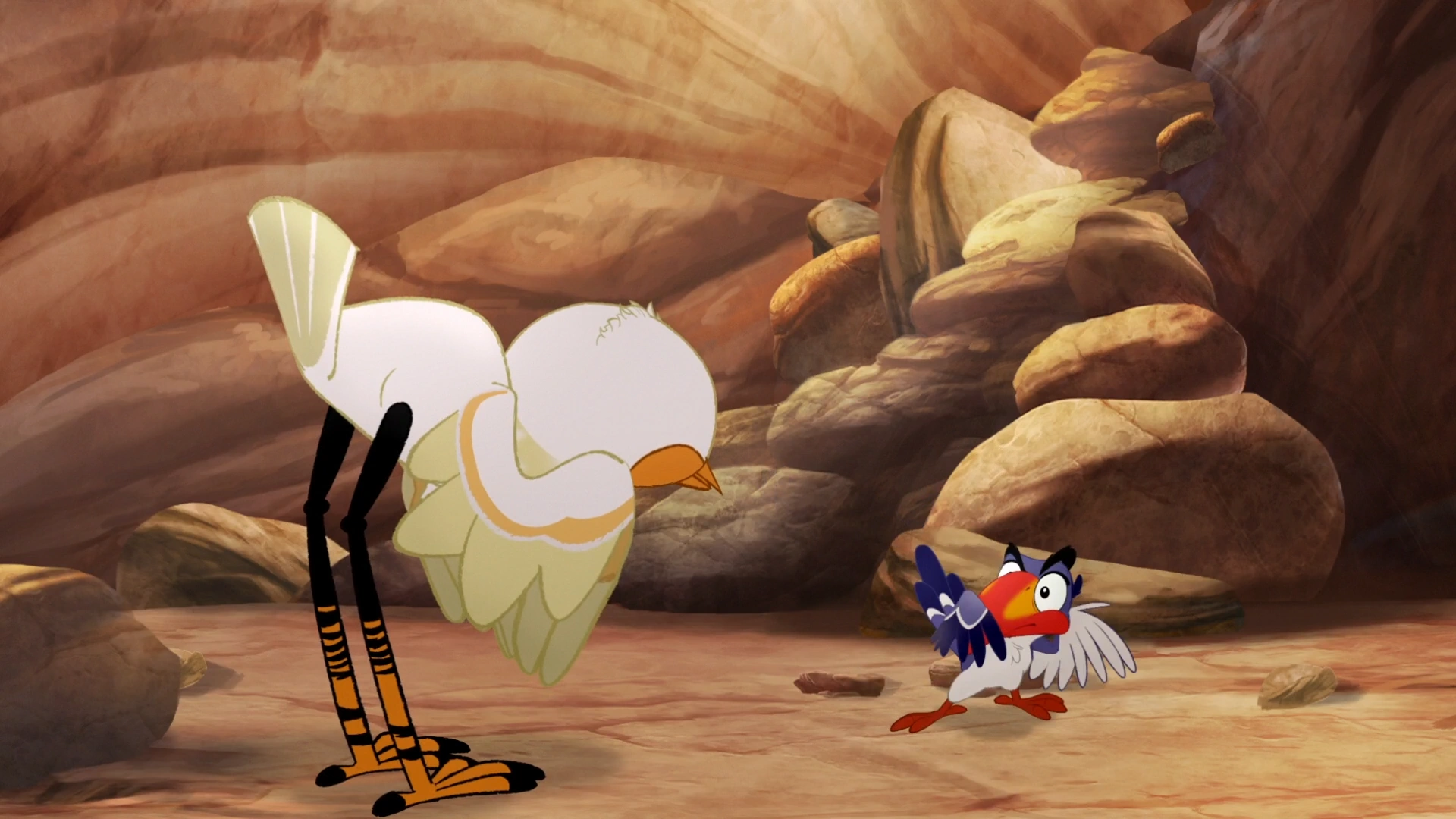 Zazu flinches upon noticing Ono's missing crest feathers.